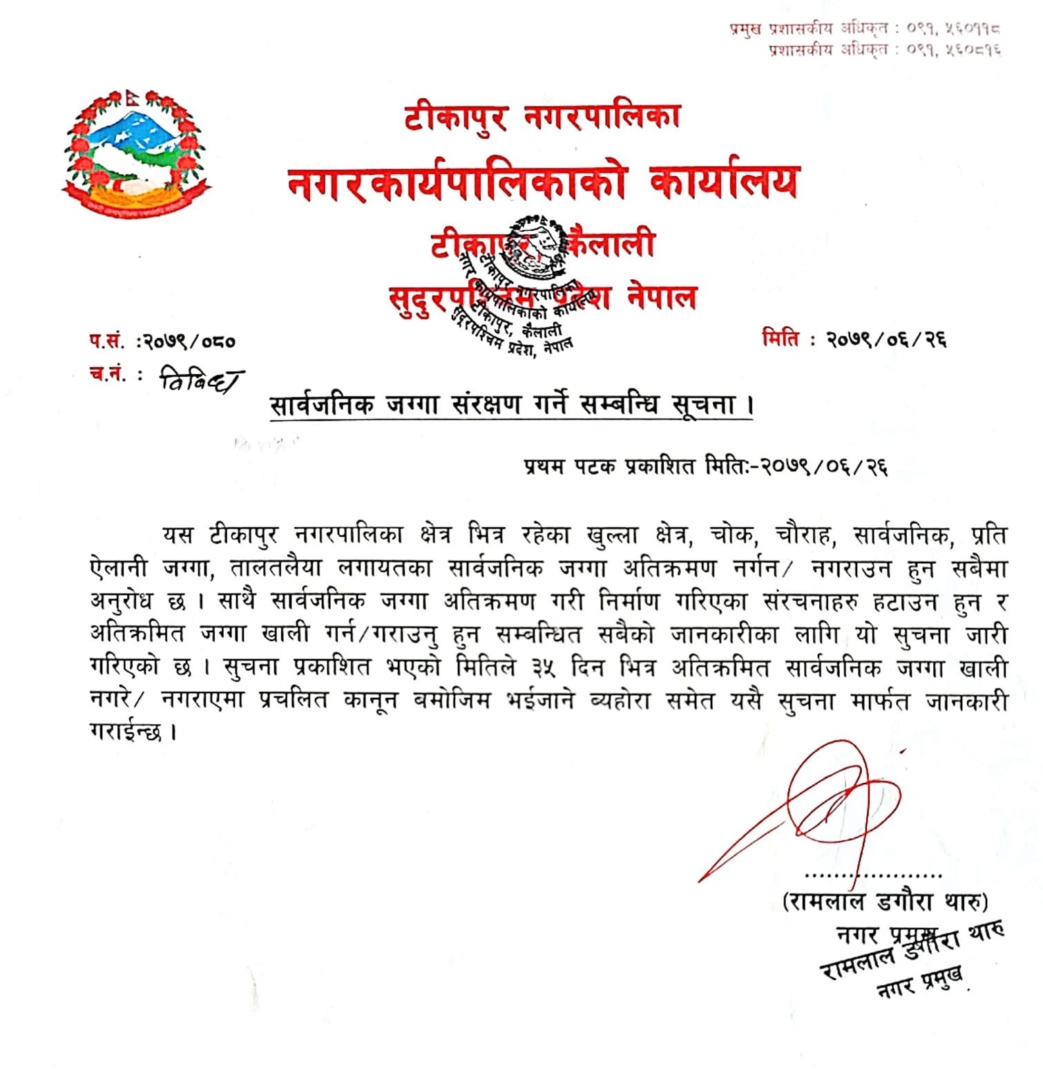 नगर प्रमुख रामलाल डगौरा थारुद्धारा जारी सूचनामा अतिक्रमित सार्वजनिक जग्गा खाली गर्न भनिएको छ ।