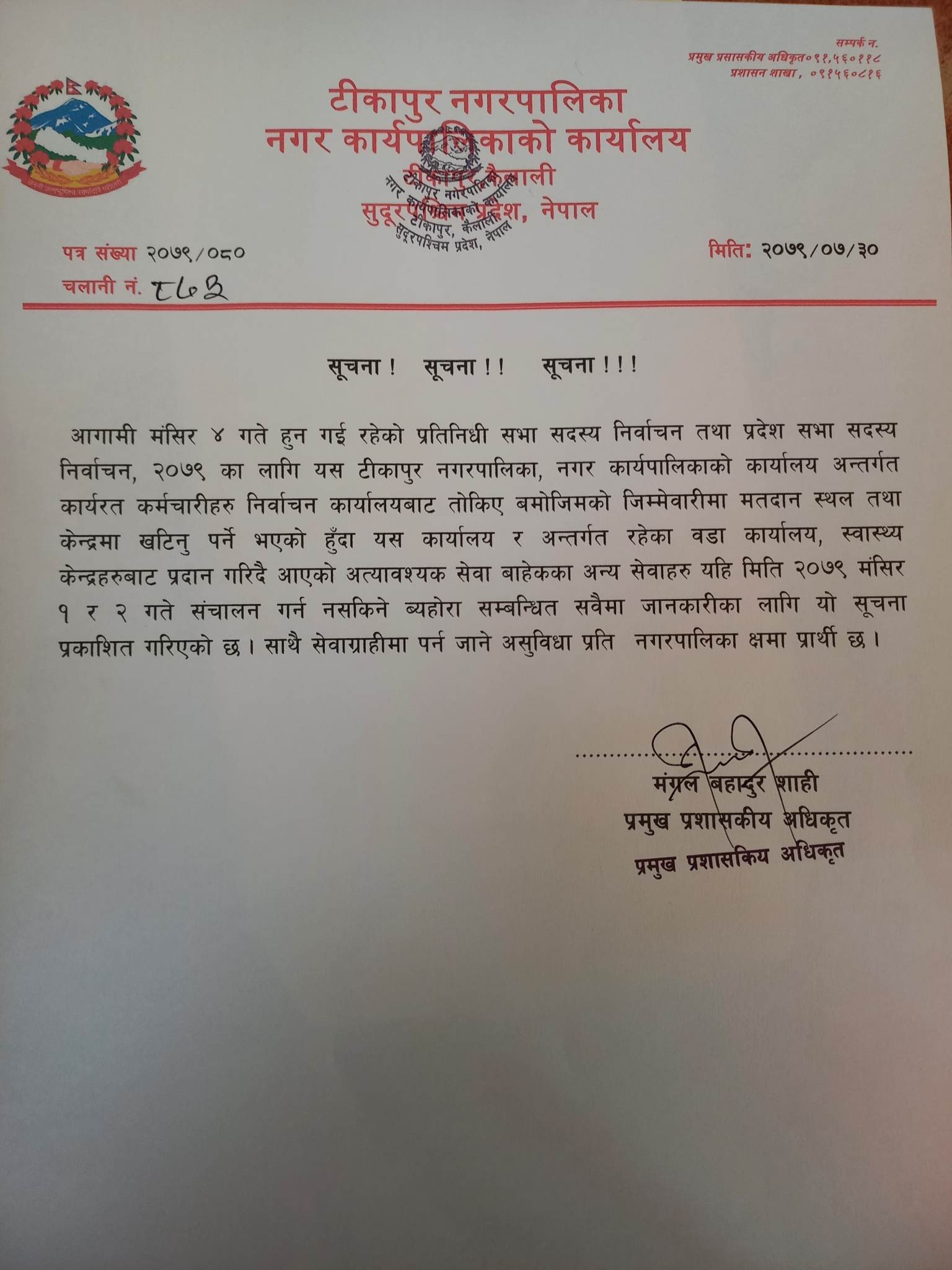 नगरपालिकाका प्रमुख प्रशासकीय अधिकृत मंगलबहादुर शाहीद्धारा जारी सूचनामा नगरपालिकाका कर्मचारीहरु मंसिर ४ गते हुने निर्वाचनमा खटिने भएकाले नगरपालिका बन्द हुने उल्लेख छ ।