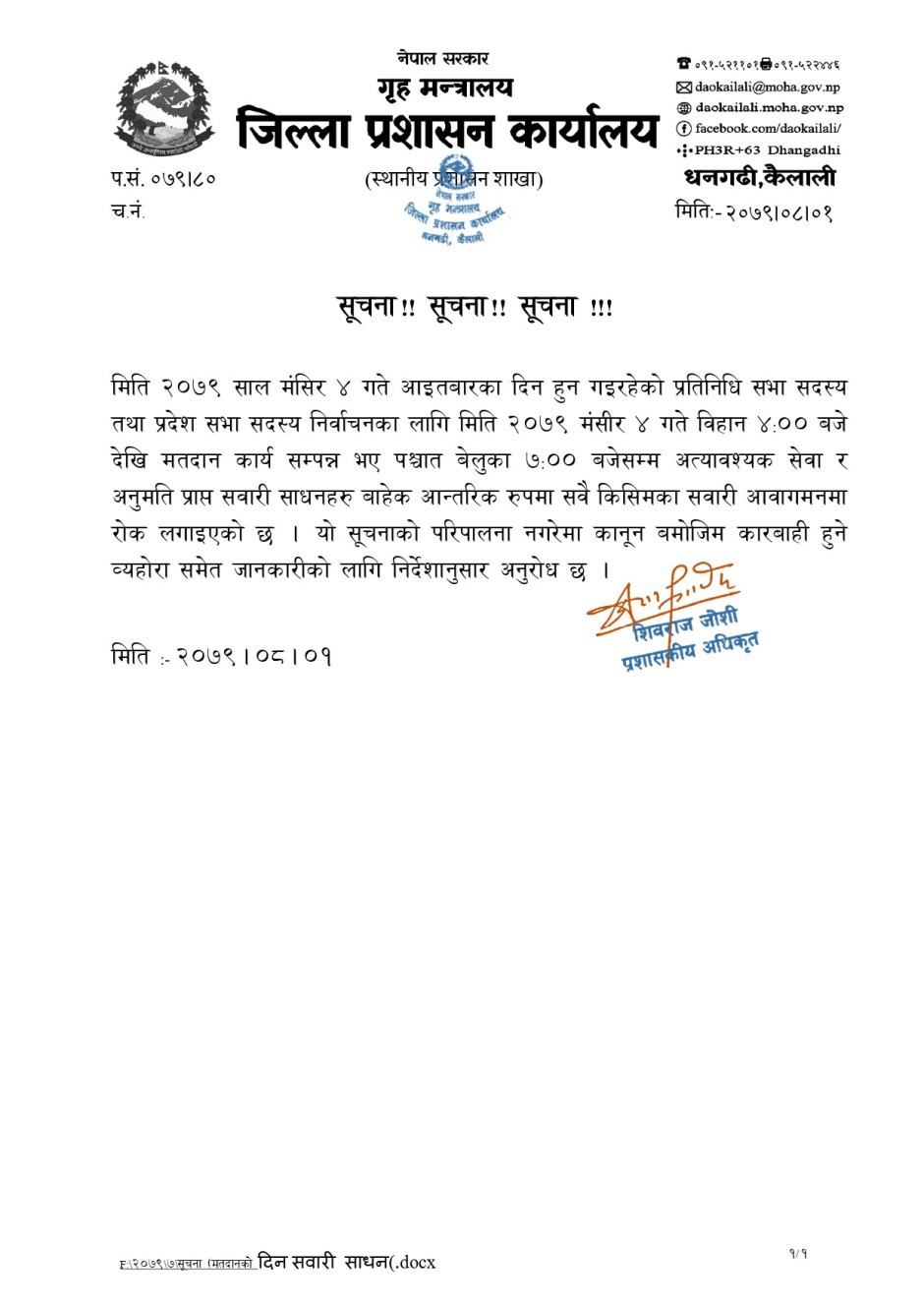 मतदानको दिन कसैले मापदण्ड विपरित सवारी साधन प्रयोग गरेको पाइएमा कारबाही गरिने जिल्ला प्रशासन कार्यालय कैलालीले जनाएको छ ।