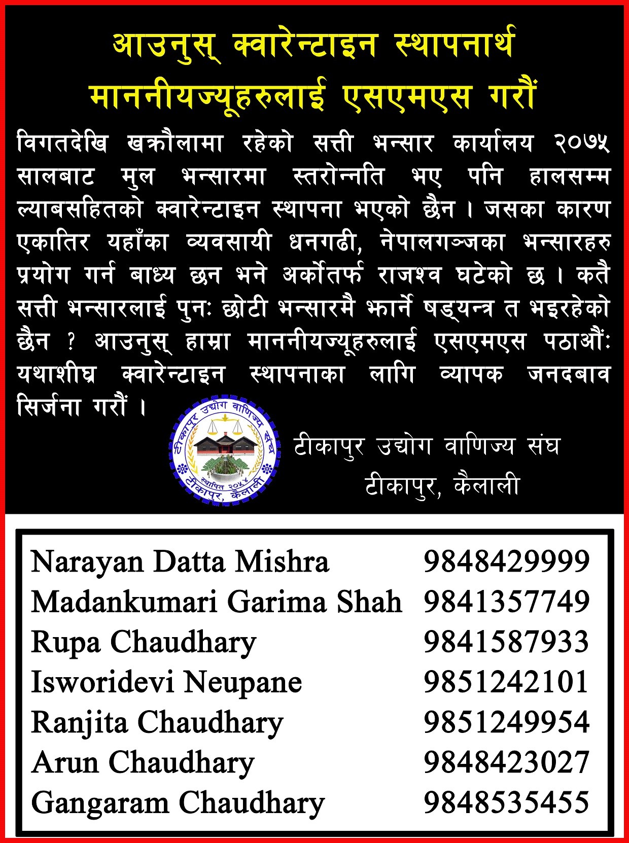 क्वारेन्टाइनको माग गर्दै आन्दोलनमा उत्रिएको टीकापुर उद्योग वाणिज्य संघको आव्हनमा कैलाली क्षेत्र नं. १, २ र ३ का स्थानीयहरुले यस क्षेत्रबाट प्रतिनिधित्व गर्ने संघीय प्रतिनिधिलाई एसएमएस पठाउन थालेका हुन् ।