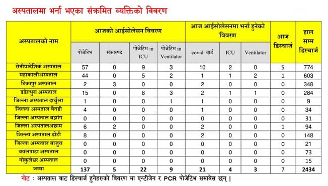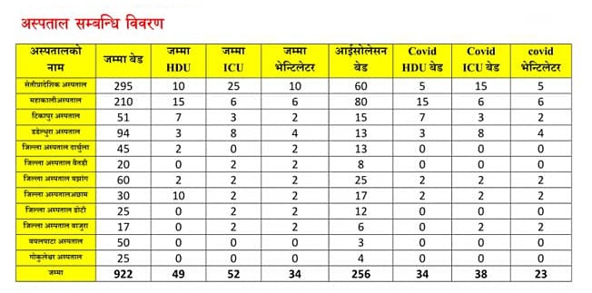 सेती प्रादेशिक अस्पतालका अनुसार संक्रमितको संख्या बढ्दै गएपछि अस्पतालमा बेड र अक्सिजनको अभाव हुन लागेको छ । सूचना अधिकारी श्रेष्ठका अनुसार शुक्रबारसम्म अस्पतालमा तीन जना भेन्टिलेटर, नौ जना आइसियु, ३५ जनालाई अक्सिजनको सर्पोट र १० जना मध्यम उपचारमा रहेका छन । टीकापुर अस्पतालमा दुई जना संक्रमितको उपचार भइरहेको छ ।